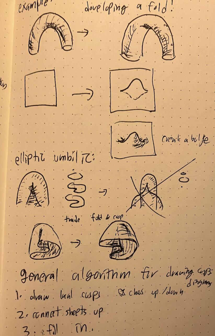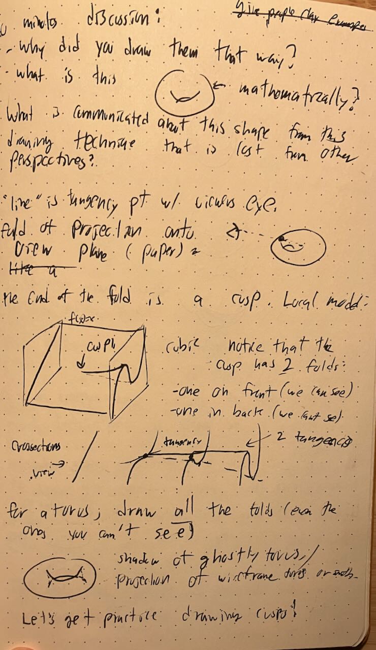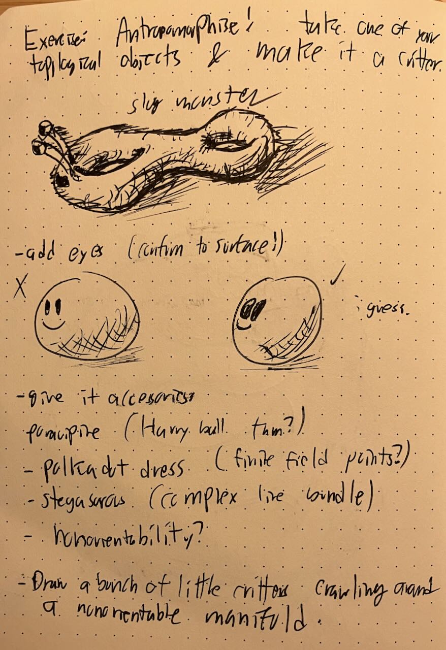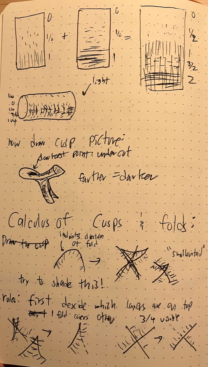 For the number theory conference, I ran a workshop on mathematical drawing. I introduced cusps and folds, and taught people about crosshatching. Afterwards, we drew topological critters.